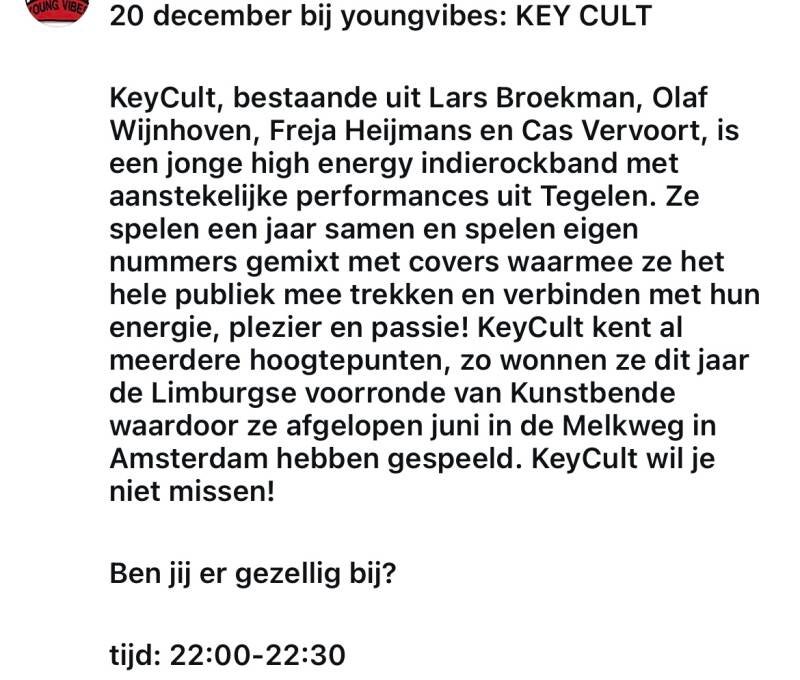 Hier staan de Artiesten en Bands die optreden of opgetreden hebben binnen Young Vibes.